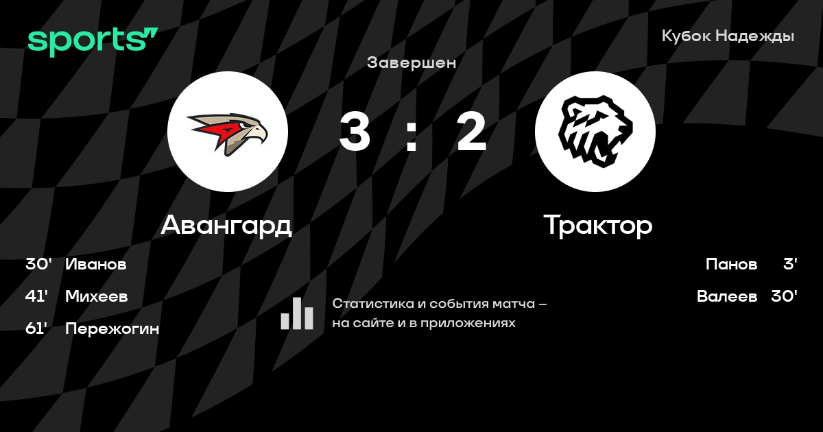 В прошедшем матче в рамках турнира Кубок Надежды (Кубок Надежды. Полуфинал) состоялась встреча команд Авангард - Трактор в городе Омск (Россия) на стадионе G-Drive Арена (вместимость - 12011)