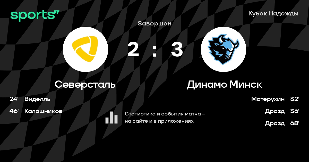 В прошедшем матче в рамках турнира Кубок Надежды (Кубок Надежды. Полуфинал) состоялась встреча команд Северсталь - Динамо Минск в городе Минск (Беларусь) на стадионе Арена-Минск (вместимость - 15000)