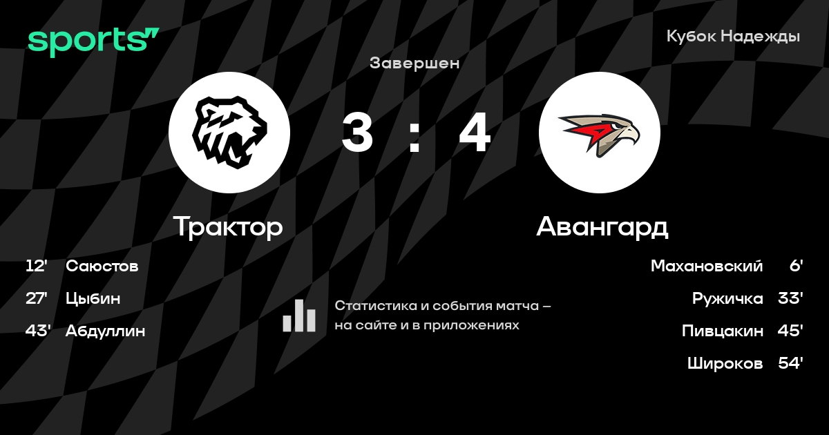 В прошедшем матче в рамках турнира Кубок Надежды (Кубок Надежды. Полуфинал) состоялась встреча команд Трактор - Авангард в городе Челябинск (Россия) на стадионе Арена Трактор (вместимость - 7500)