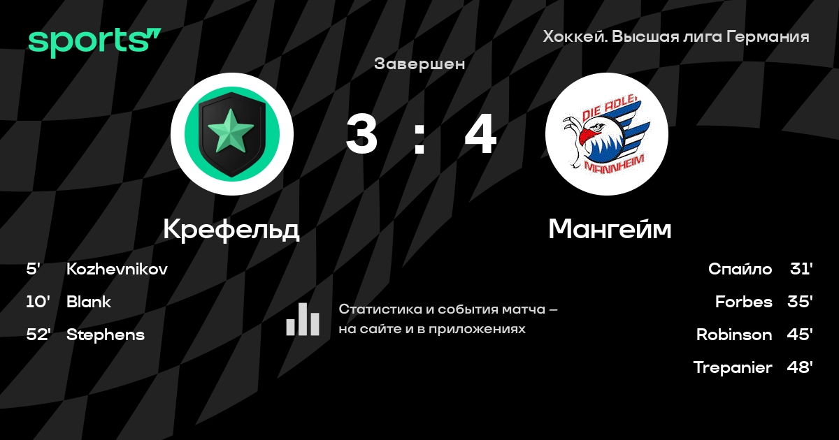 В прошедшем матче в рамках турнира Хоккей. Высшая лига Германия состоялась встреча команд Крефельд - Мангейм