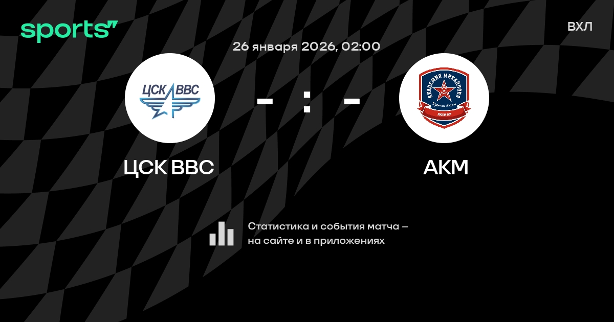 В предстоящем матче в рамках турнира ВХЛ пройдет встреча команд ЦСК ВВС - АКМ в городе на стадионе Dvorets sporta im. V. S. Vysotskogo.