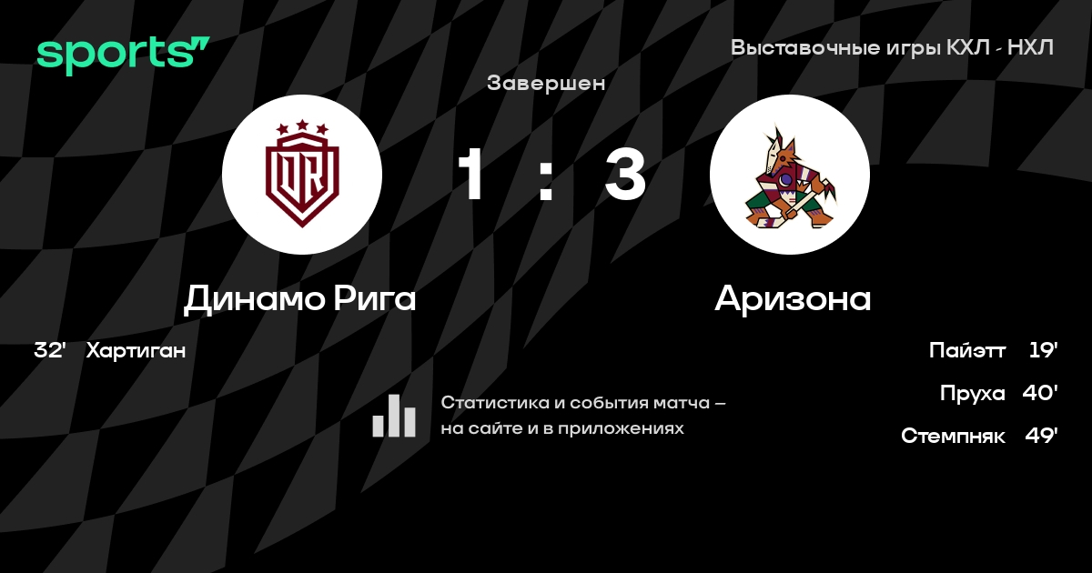 В прошедшем матче в рамках турнира Выставочные игры КХЛ - НХЛ состоялась встреча команд Динамо Рига - Аризона в городе Рига (Латвия) на стадионе Арена-Рига (вместимость - 12500)