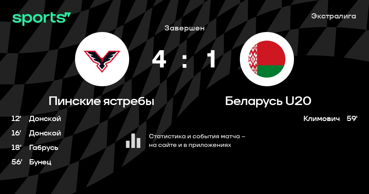 В прошедшем матче в рамках турнира Экстралига состоялась встреча команд Пинские ястребы - Беларусь U20 в городе Пинск (Беларусь) на стадионе Ледовый дворец спорта Пинск (вместимость - 598)