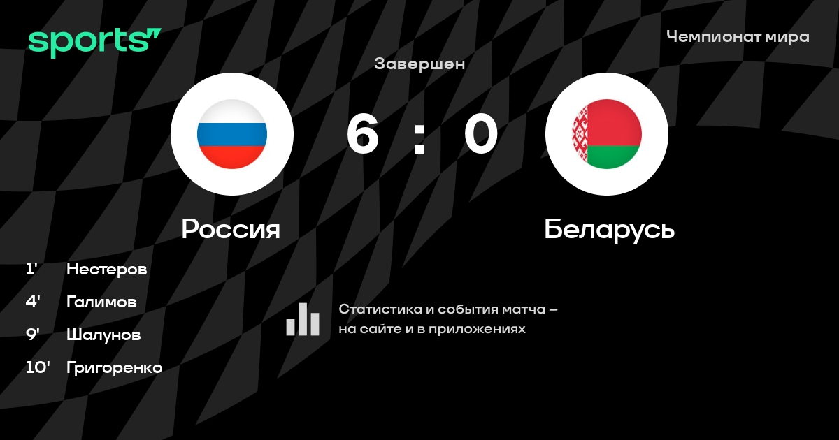 В прошедшем матче в рамках турнира Чемпионат мира (Группа A) состоялась встреча команд Россия - Беларусь в городе Рига (Латвия) на стадионе Олимпийский спортивный центр (вместимость - 2500)