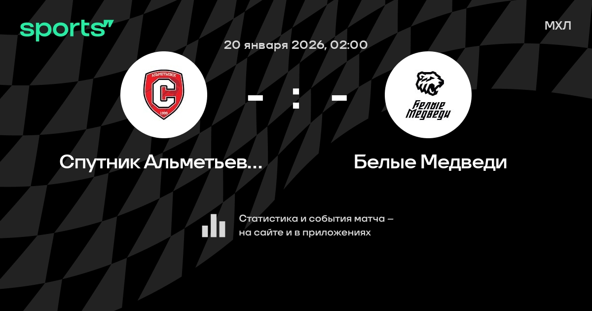 В предстоящем матче в рамках турнира МХЛ пройдет встреча команд Спутник Альметьевск - Белые Медведи в городе на стадионе Dvorets Sporta Yubileynyy.