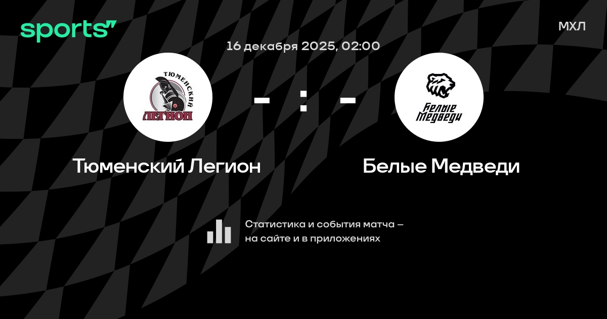 В предстоящем матче в рамках турнира МХЛ пройдет встреча команд Тюменский Легион - Белые Медведи в городе на стадионе Ledovyy Dvorets Sporta Im. N.v. Parysheva.