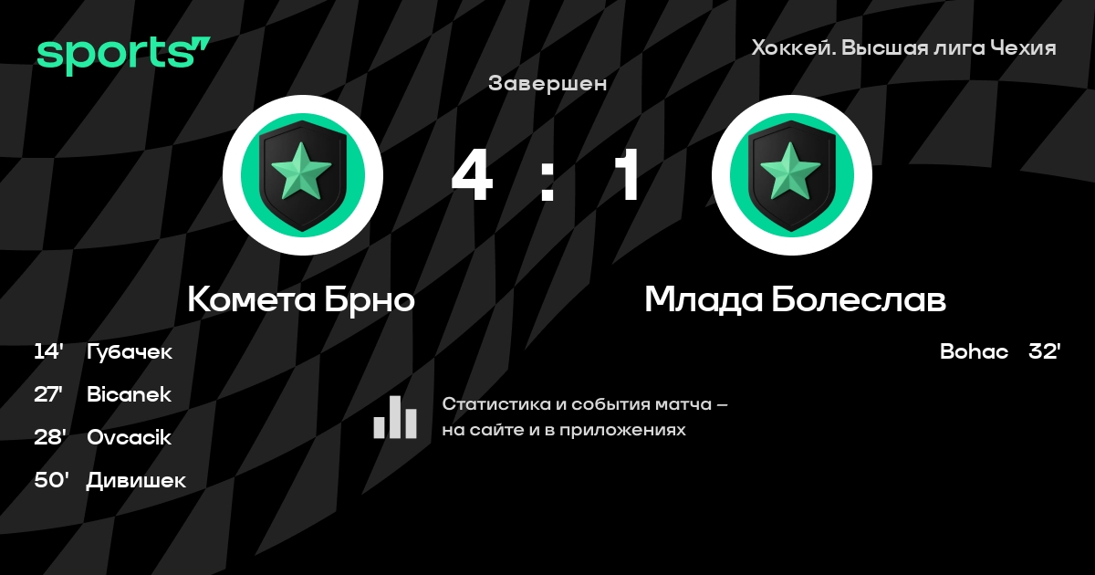 В прошедшем матче в рамках турнира Хоккей. Высшая лига Чехия состоялась встреча команд Комета Брно - Млада Болеслав