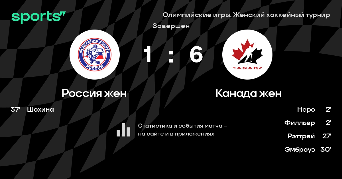 В прошедшем матче в рамках турнира Олимпийские игры. Женский хоккейный турнир состоялась встреча команд Россия жен - Канада жен в городе на стадионе Cadillac Arena