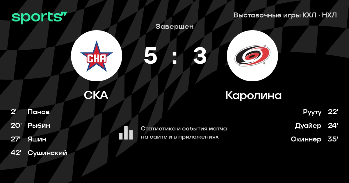 В прошедшем матче в рамках турнира Выставочные игры КХЛ - НХЛ состоялась встреча команд СКА - Каролина в городе Санкт-Петербург (Россия) на стадионе Ледовый дворец (вместимость - 13000)