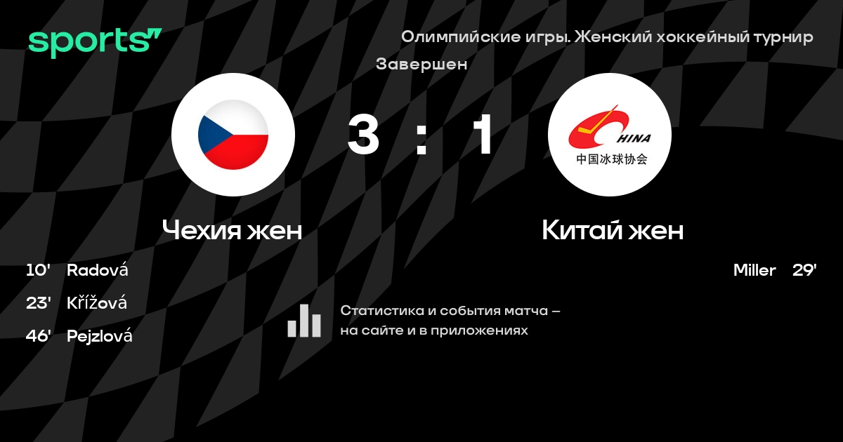 В прошедшем матче в рамках турнира Олимпийские игры. Женский хоккейный турнир состоялась встреча команд Чехия жен - Китай жен в городе на стадионе Cadillac Arena