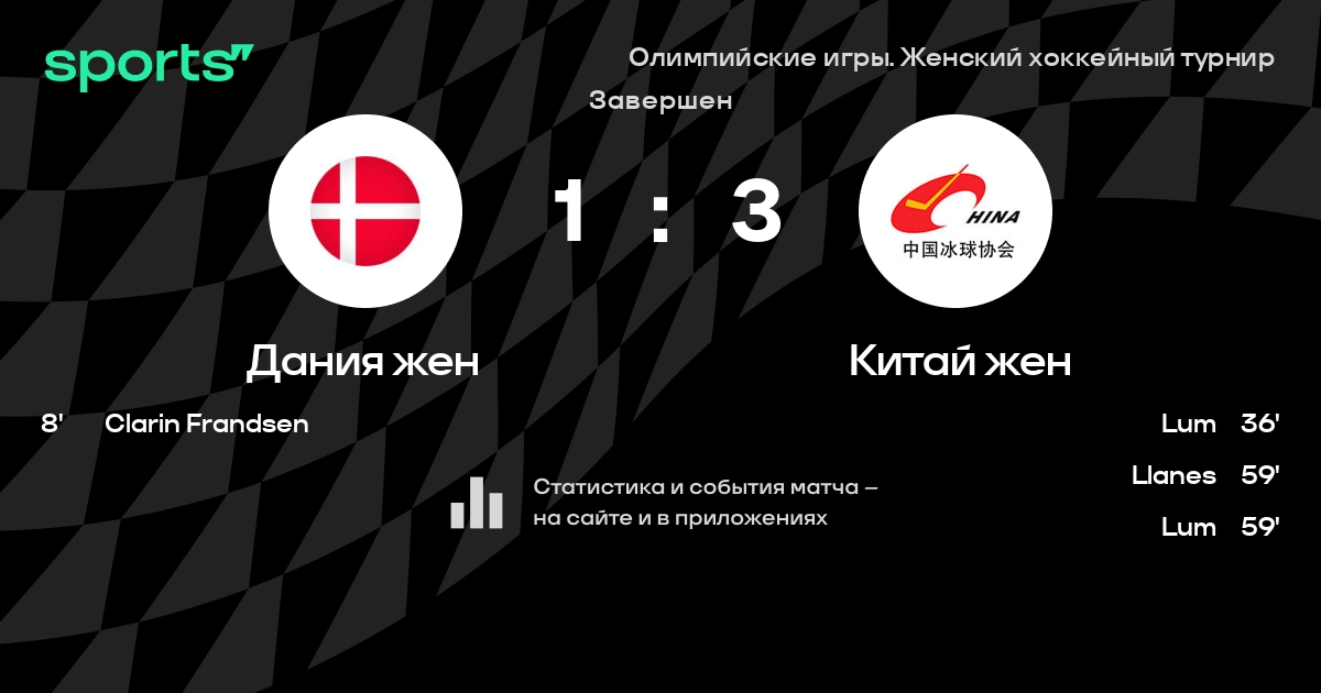 В прошедшем матче в рамках турнира Олимпийские игры. Женский хоккейный турнир состоялась встреча команд Дания жен - Китай жен в городе на стадионе Cadillac Arena
