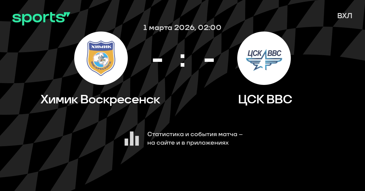 В предстоящем матче в рамках турнира ВХЛ пройдет встреча команд Химик Воскресенск - ЦСК ВВС в городе на стадионе Podmoskovie Ice Palace.
