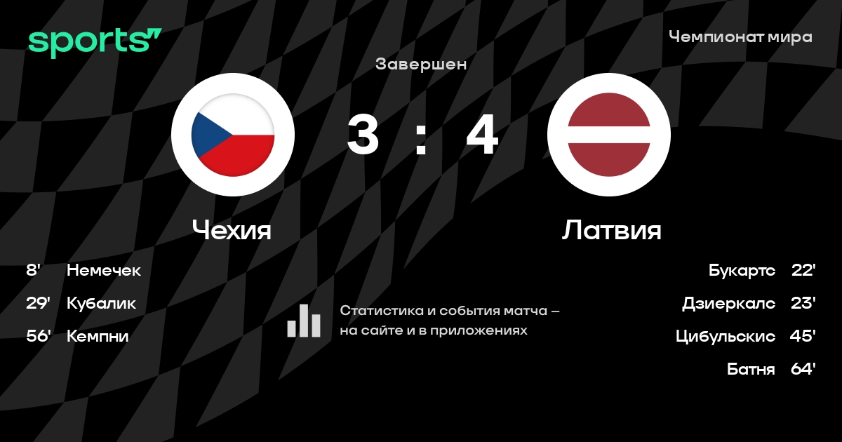В прошедшем матче в рамках турнира Чемпионат мира (Группа B) состоялась встреча команд Чехия - Латвия в городе Рига (Латвия) на стадионе Арена-Рига (вместимость - 12500)