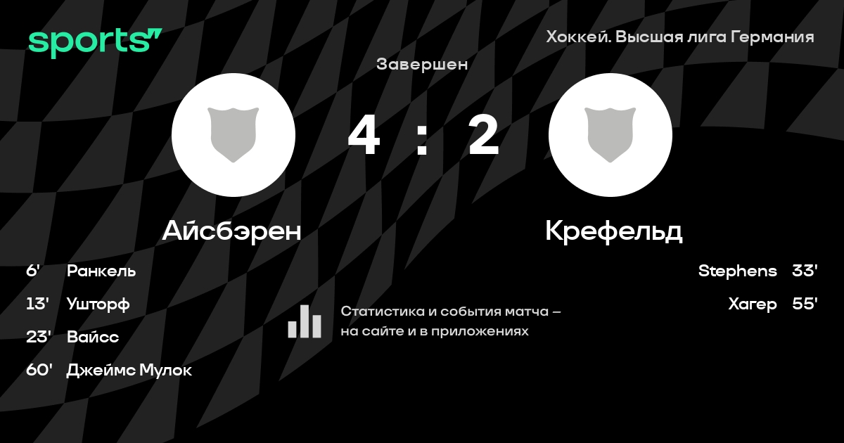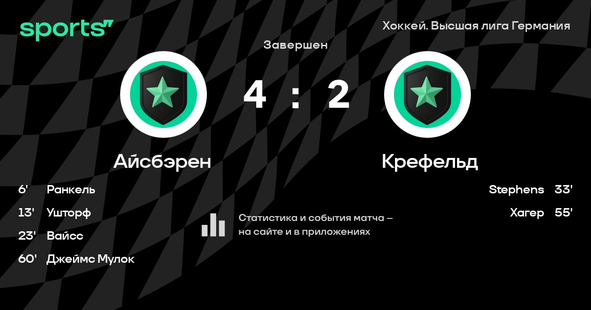 В прошедшем матче в рамках турнира Хоккей. Высшая лига Германия состоялась встреча команд Айсбэрен - Крефельд