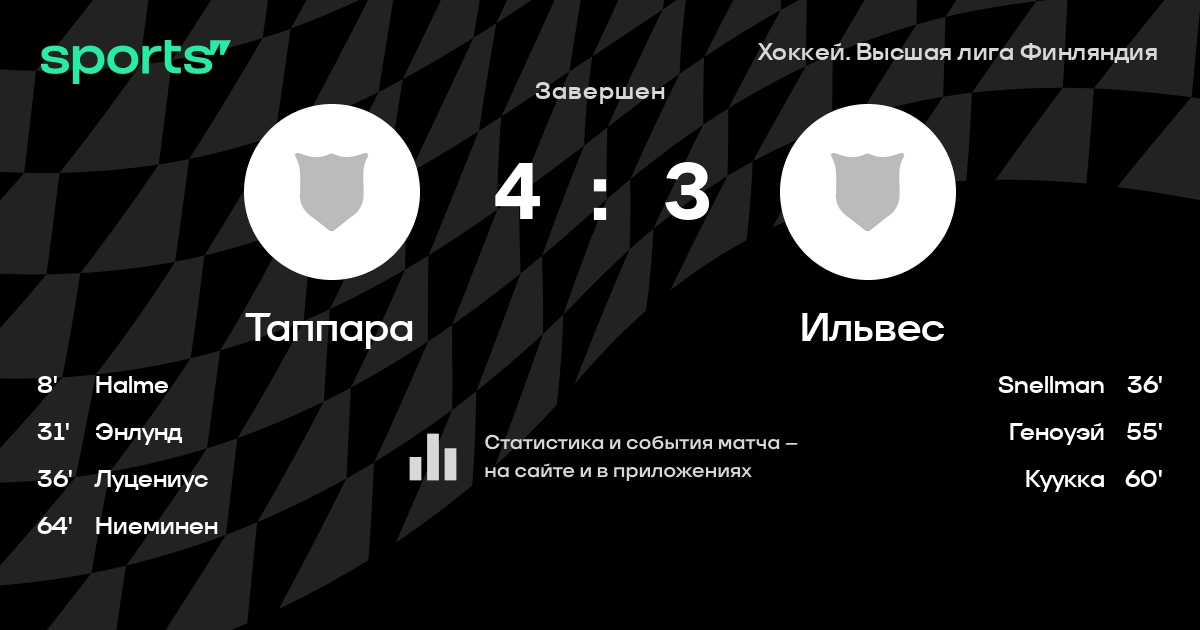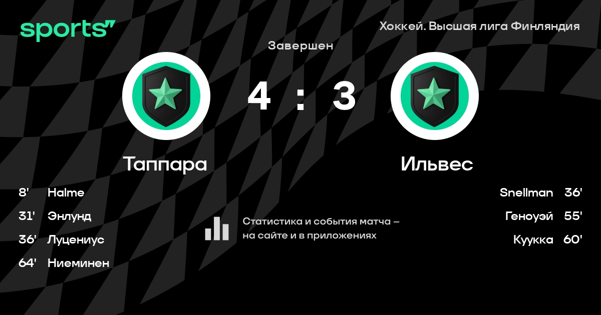 В прошедшем матче в рамках турнира Хоккей. Высшая лига Финляндия состоялась встреча команд Таппара - Ильвес