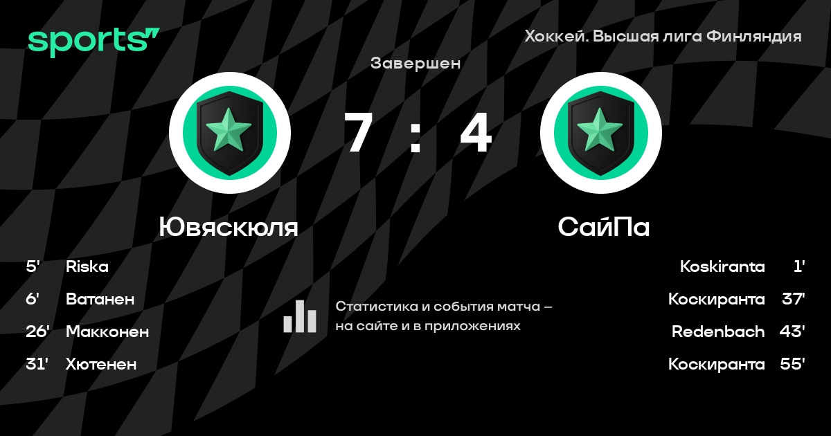 В прошедшем матче в рамках турнира Хоккей. Высшая лига Финляндия состоялась встреча команд Ювяскюля - СайПа