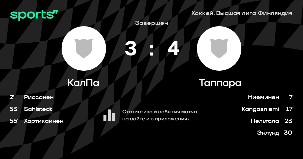 В прошедшем матче в рамках турнира Хоккей. Высшая лига Финляндия состоялась встреча команд КалПа - Таппара