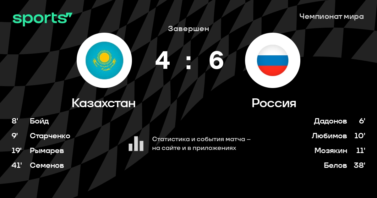 В прошедшем матче в рамках турнира Чемпионат мира (Группа A) состоялась встреча команд Казахстан - Россия в городе Москва (Россия) на стадионе ЦСКА-Арена (вместимость - 5600)
