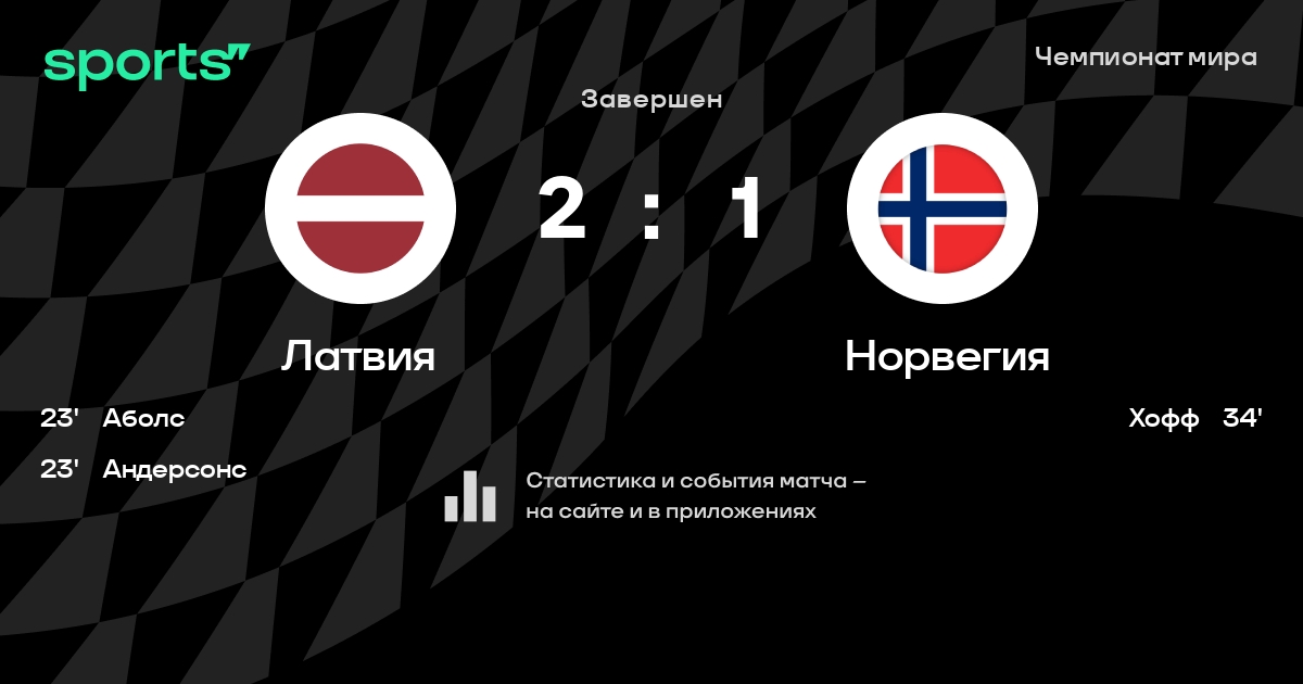 В прошедшем матче в рамках турнира Чемпионат мира (Группа B) состоялась встреча команд Латвия - Норвегия в городе Рига (Латвия) на стадионе Арена-Рига (вместимость - 12500)