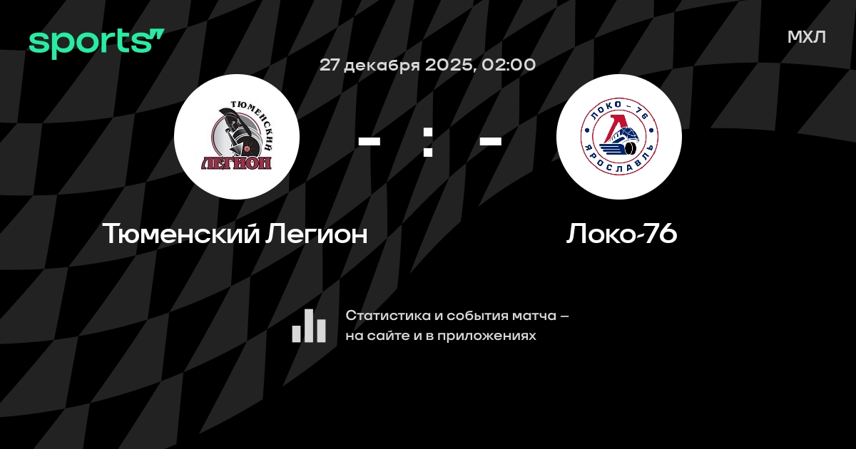 В предстоящем матче в рамках турнира МХЛ пройдет встреча команд Тюменский Легион - Локо-76 в городе на стадионе Ledovyy Dvorets Sporta Im. N.v. Parysheva.