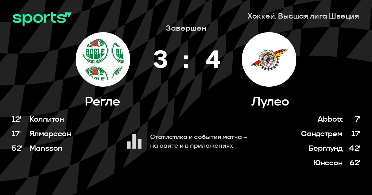 В прошедшем матче в рамках турнира Хоккей. Высшая лига Швеция состоялась встреча команд Регле - Лулео