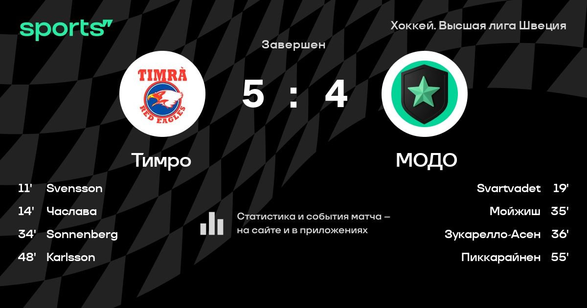 В прошедшем матче в рамках турнира Хоккей. Высшая лига Швеция состоялась встреча команд Тимро - МОДО