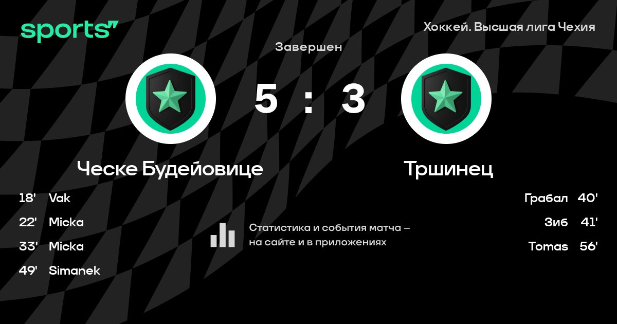 В прошедшем матче в рамках турнира Хоккей. Высшая лига Чехия состоялась встреча команд Ческе Будейовице - Тршинец