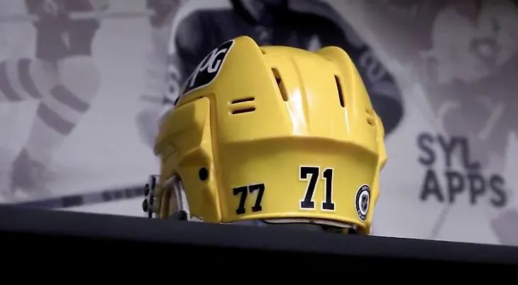 Малкин вышел на матч в шлеме с 77-м номером – в память об игроке МХЛ, который умер после попадания шайбы в голову