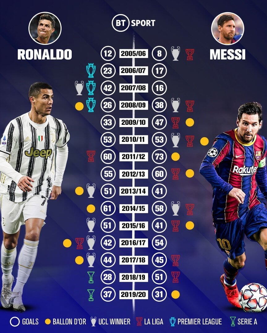 Сравнительная статистика #Криштиану Роналду и #Лионель Месси на клубном уровне в каждом сезоне по голам, «Золотым мячам», кубкам Лиги чемпионов и трофеям лиг начиная с сезона-2005/06.