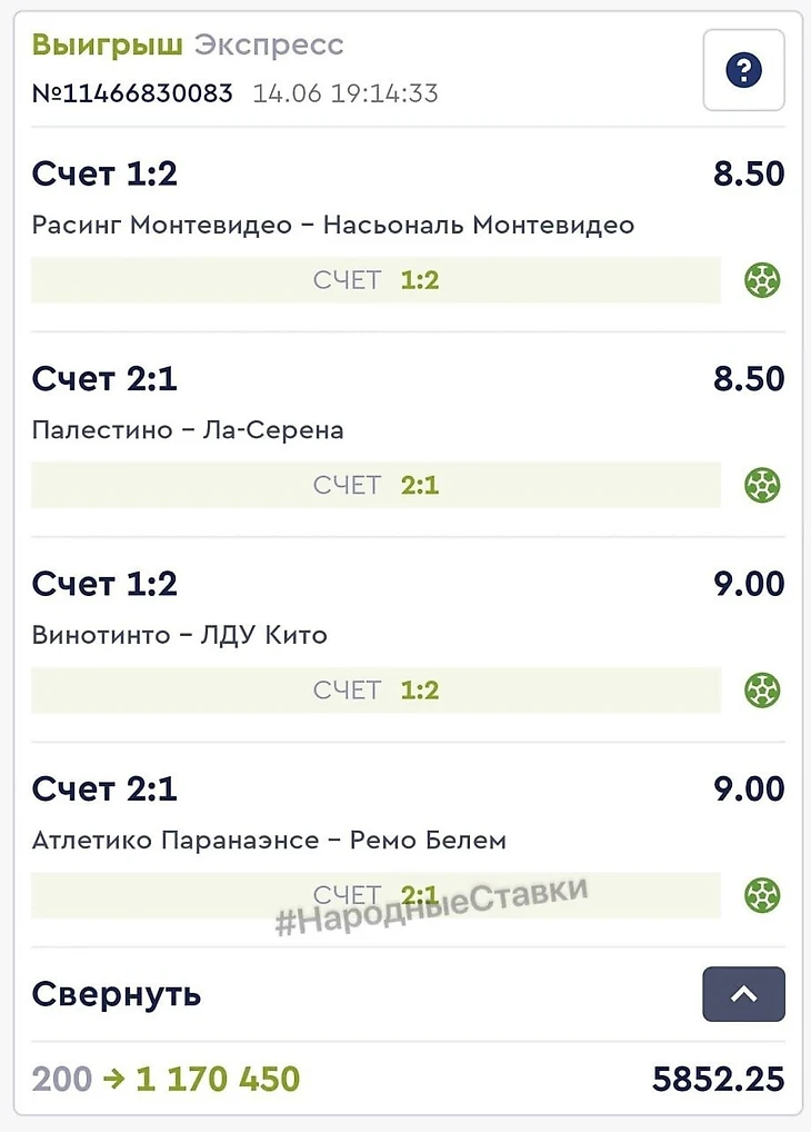 Беттор поставил 200 рублей на экспресс из четырех футбольных матчей с общим коэффициентом 5852.25. Во всех встречах игрок поставил на точный счет 2:1.
