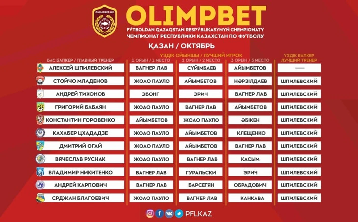 ПФЛК определила лучшего игрока КПЛ в октябре по версии главных тренеров команд.