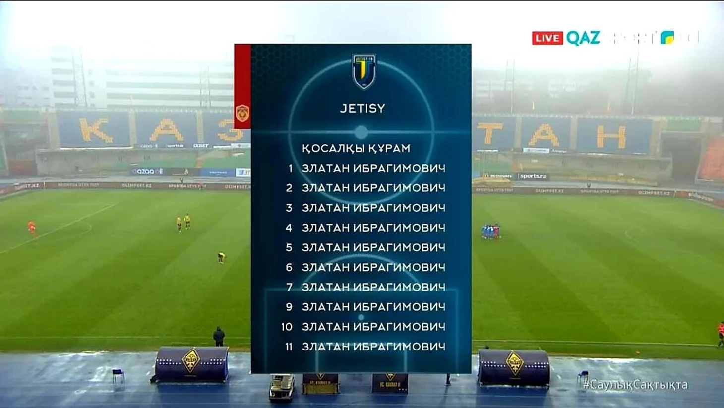 Первым отличился «Qazsport» еще до начала игры. Режиссер допустил ошибку в титрах состава «Жетысу»: на скамейке запасных у талдыкорганцев – 10 Златанов.
