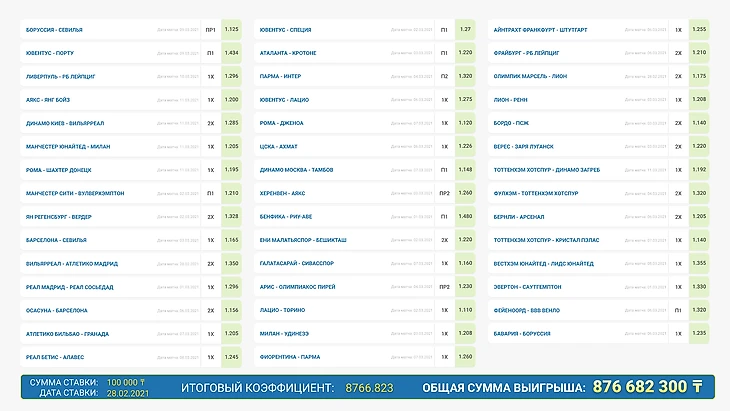 При этом, стоит отметить, что для экспресса выбирались события с не самыми высокими коэффициентами – самый большой из них был равен 1,48. Большинство ставок было сделано на фаворитов футбольных матчей в еврокубках и ведущих европейских чемпионатов. Такая последовательная тактика привела к щедрому вознаграждению прогнозиста.