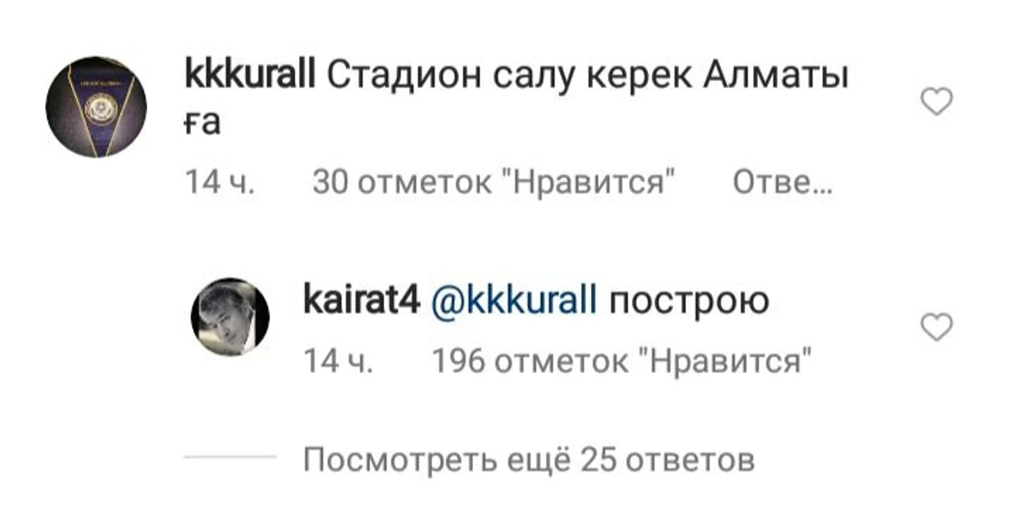 Один из пользователей социальной сети написал, что было бы хорошо построить стадион. На что Боранбаев ответил пользователю: «построю».