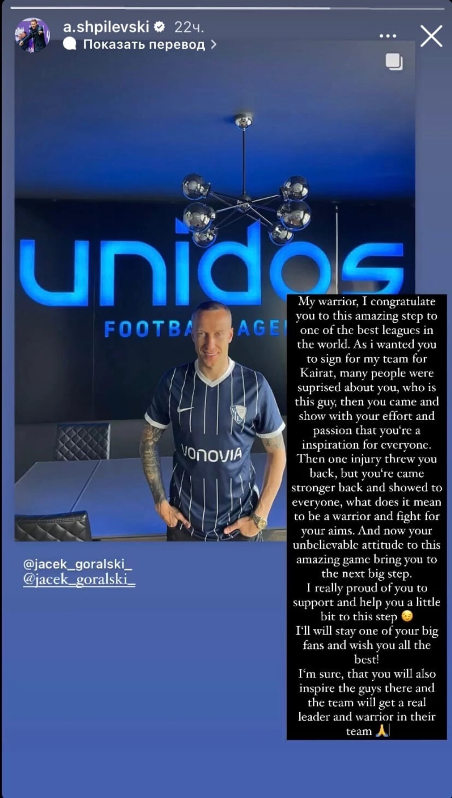 – Мой воин, я поздравляю тебя с этим удивительным шагом в одну из лучших лиг в мире. Когда я хотел подписать тебя в «Кайрат», многие люди удивлялись и спрашивали, кто этот парень. Но потом ты пришел и показал своим старанием и страстью, что ты являешься вдохновлением всех. Травма отбросила тебя назад, но ты вернулся сильнее и показал всем, что значит быть воином и бороться за свои цели. И сейчас твое невероятное отношение к этой удивительной игре привело тебя к следующему большому шагу.
