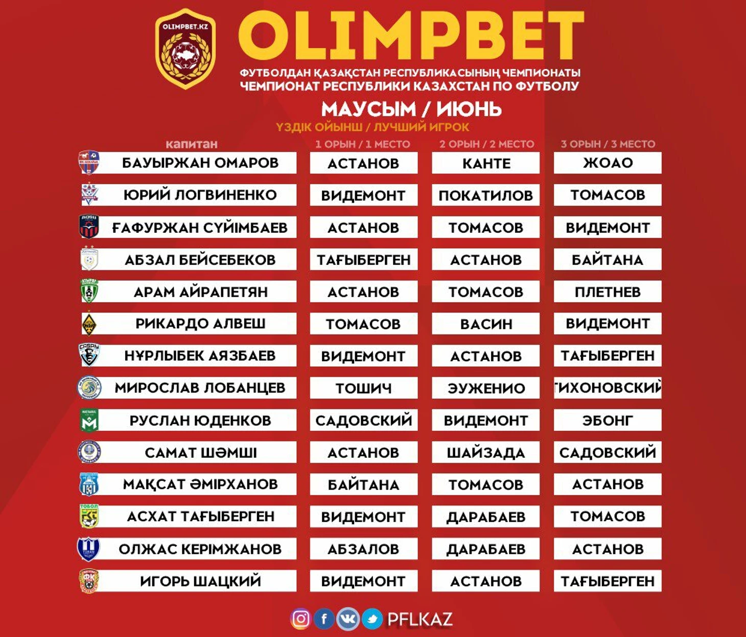 Лучшим игроком июня назван полузащитник «Ордабасы» и сборной Казахстана Эльхан Астанов, забивший за клуб и национальную команду три мяча и сделавший столько же голевых передач.