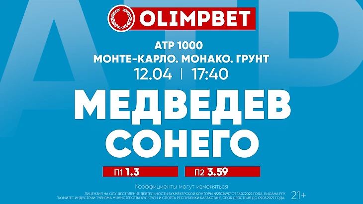 Эксперты Olimpbet читают, что класс возьмет верх, и Медведев проблем в своем первом матче в Монте-Карло не испытает – П1 – 1.3, П2 –  3.59. Кэф на результат 2:0 при этом 1.84.