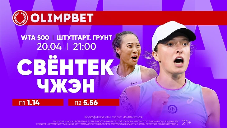 Напомним: 21-летняя Свентек выигрывала турнир в Штутгарте в прошлом году и, очевидно, стоит классом выше талантливой китаянки. Неудивительно, что аналитики Olimpbet явно склоняются в сторону победы польки – П1 – 1.14, П2 – 5.56.