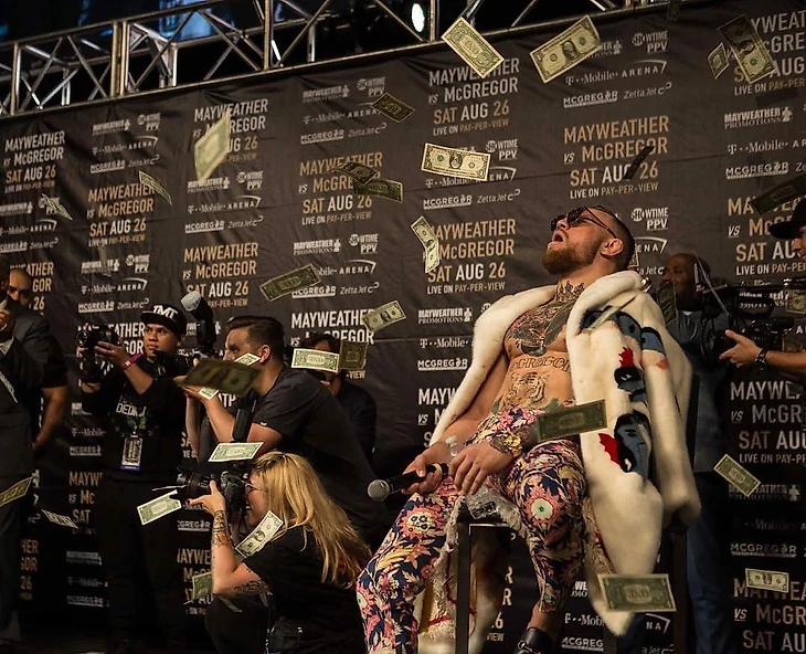 2017 год. Лето. Жара. Воздух напряжен и наэлектризован. Включены камеры на телефонах, у операторов мигают красные огни прямого эфира. Фотоаппараты щелкают со вспышкой. Люди между собой перешептываются. И ... тут вырывается он. Он – один из главных героев всего торжества. С уложенной прической, где не торчит ни одна рыжая прядь, в солнцезащитных очках, голым торсом, из-под норковой шубы от Victoria’s Secrets, которая стоит несколько десятков тысяч долларов, горят татуировки, шагает медленно к Флойду Мейвезеру. После взаимных оскорблений, как принято раскручивать бои и эмоции соперников, Флойд, как человек никогда не проигравший на ринге, бросает в воздух пачки долларов со словами: «Есть только одно божественное творение и это список моих побед…». Главный герой, улыбаясь, получая удовольствие от шоу вокруг него, довольно и расслабленно выйдет к журналистам: «Вы ощущаете меня в своей шкуре? Я на вершине мира, в норковой, мать его, шубе. И мне поеб*ть…».
