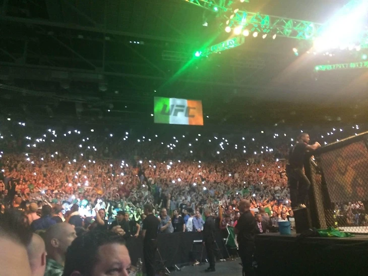 На O2 Арене в Дублине, 19 июля 2014 года было свыше 10000 зрителей. В зале так шумно, что в раздевалке можно было услышать, что творится на арене. Журналисты, которые профессионально писали о UFC несколько лет, описывая тот вечер, признавали, что это самый громкий вечер в истории UFC. Работавшие в тот вечер работники и персонал обменивались удивленными взглядами между собой. Такого в их жизни не было. «Публика здесь такая, какой я никогда не видел раньше», - признался после турнира Дана Уайт: «Я в этом бизнесе уже тринадцать лет, но я никогда не слышал ничего подобного». Это было безумие, похожая на футбольный матч, с криками «Оле! Оле!» как когда-то мечтал в детстве Конор. Когда Конор выходит к клетке, гул такой, что официально было зарегистрировано 111 децибел, что громче звука взлетающего реактивного самолета.