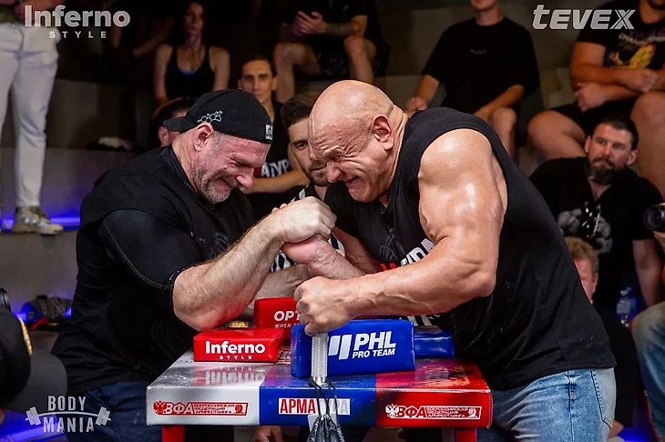 Но у Дмитрия был припрятан козырь в рукаве! «Никто не знал, что моя левая рука сильнее, чем права!» — так Дмитрий Голубочкин прокомментировал свой победный армфайт с Андреем Зайкиным. «Левая рука у Димы работает по-другому. Он очень порадовал меня! Дима жёстко выбивал Андрея верхом, а потом резко переходил в трицепс. Углы у него были максимально короткие, рычаги он не отдавал, это и привело его к победе!» - порадовался за своего ученика Денис Цыпленков.