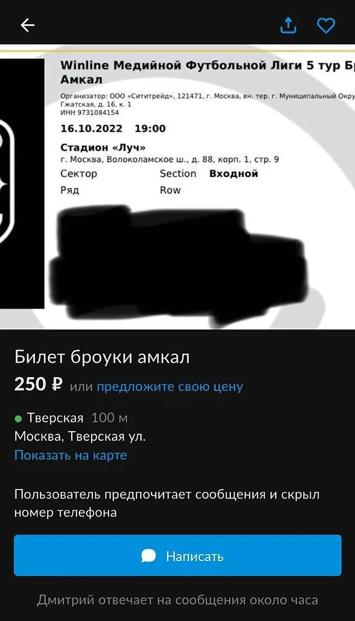Сам Дмитрий в доказательство своих слов выложил в телеграм-канале «Егоров / Едим спорт» объявление о продаже билета на матч на Avito. Билеты на игры МФЛ распространяются лигой бесплатно.