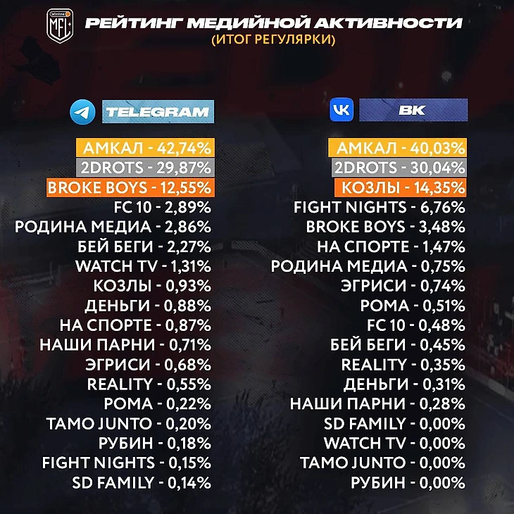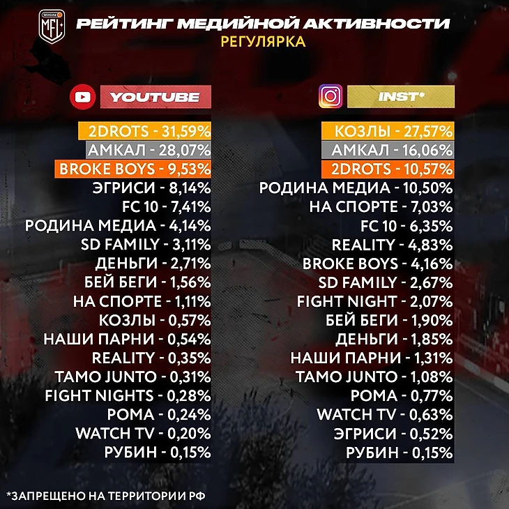 2Drots лучшие только на ютубе, GOATS обошли всех в инстаграме. Опубликован рейтинг медийной активности команд МФЛ