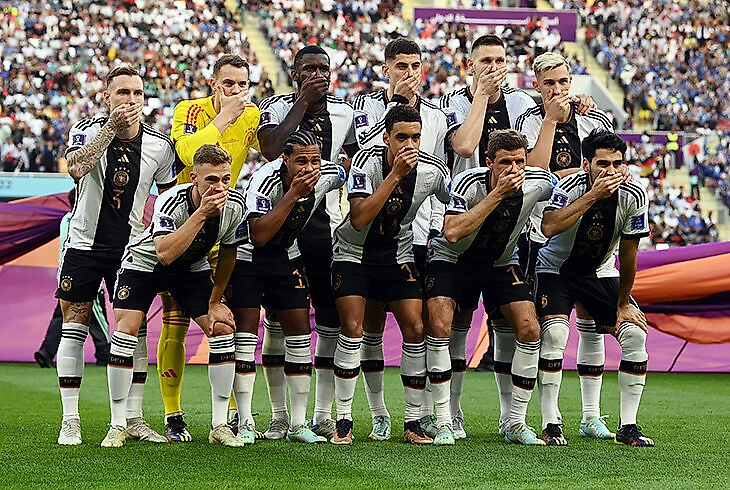 Игроки сборной Германии на командном фото перед матчем со сборной Японии (1:2) закрыли рот руками в знак протеста против ФИФА.