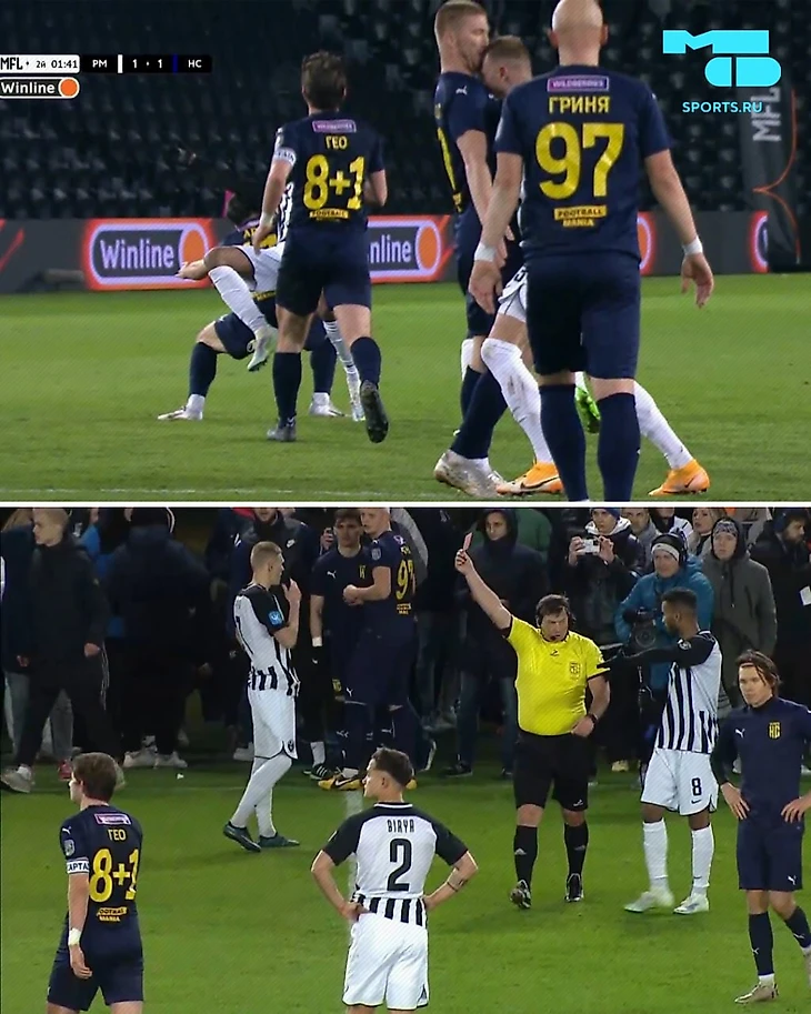 В концовке игры 35-летний хавбек нанес удар головой Антону Петровскому из «На Спорте».
