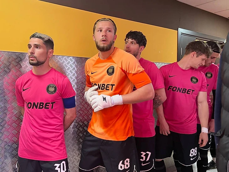 Комплект для полевых игроков состоит из розовой футболки и черных шорт и гетр, вратарский комплект – оранжево-черный.