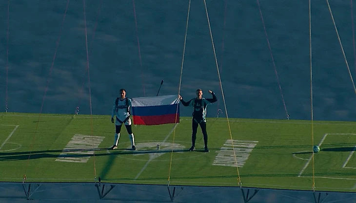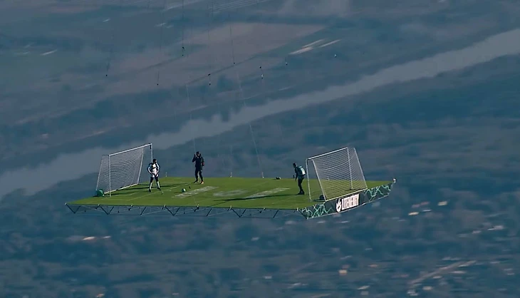 Команда блогера подготовила специальную конструкцию для игры в футбол, которая поднималась в небо на воздушном шаре высотой 36 метров. На реализацию проекта было потрачено более 30 млн рублей.