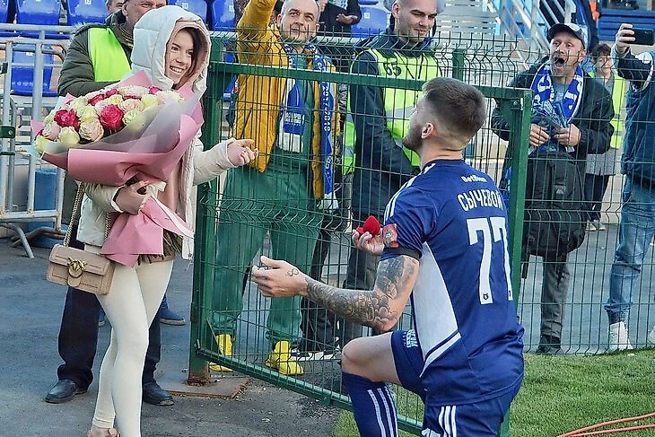 Сычевой забивает пенальти и несется, уже имея желтую, на трибуну к своей девушке, чтобы схватить цветы, вытащить из трусов кольцо и сделать ей предложение. И она, ошалев и растаяв, конечно же, соглашается.