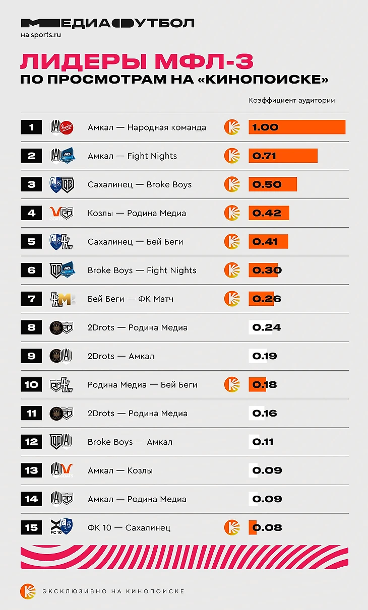 Похоже, стриминг очень полюбился фанатам «Амкала» – 6 матчей. «Родине Медиа» явно помогла победа в МФЛ-3 – 5 матчей в топе. У 2Drots лишь 3, но это логично – матчи «самураев» ни разу не показывали на «Кинопоиске» эксклюзивно.