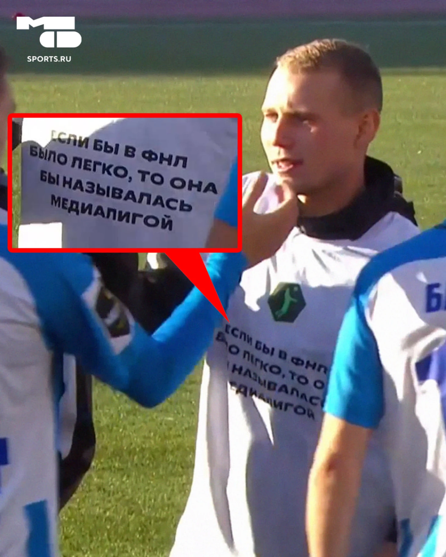 В воскресенье матч 17-го тура Мелбет Первой лиги начался с троллинга. Хавбек «Тюмени» Денис Самойлов вышел на игру с саратовским «Соколом» в футболке с надписью «Если бы в ФНЛ было легко, то она бы называлась Медиалигой».